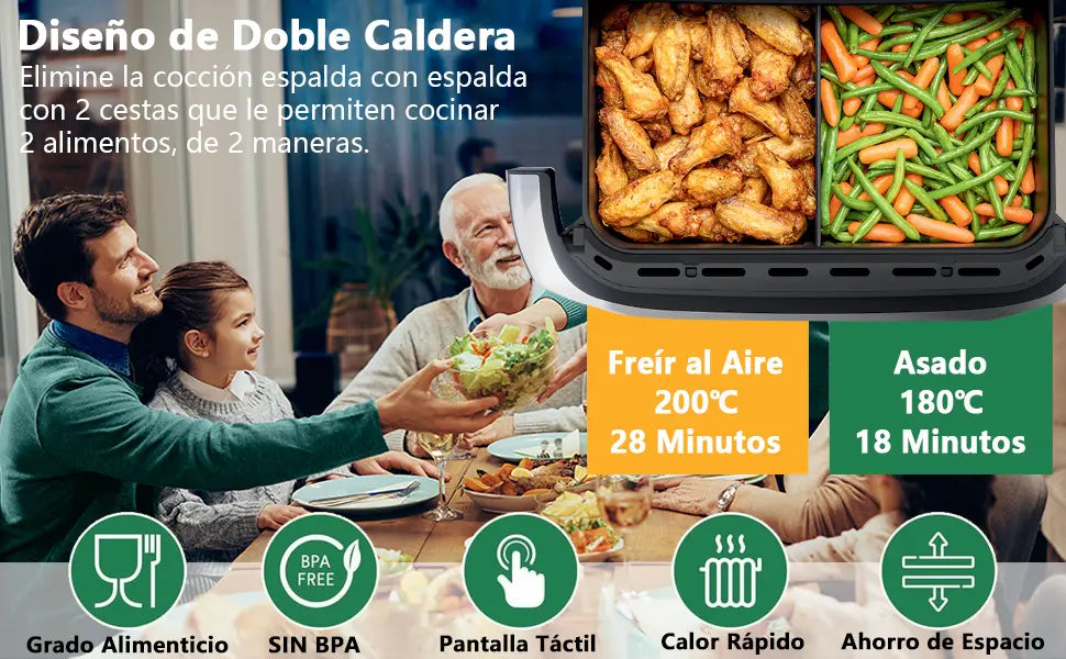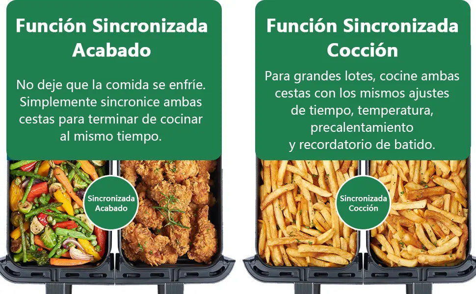 ¡Experimente la diversión de cocinar de manera eficiente con una freidora de aire de doble capa! Esta freidora de aire de 9L viene con dos cestas, lo que le permite preparar fácilmente varios platos deliciosos al mismo tiempo.