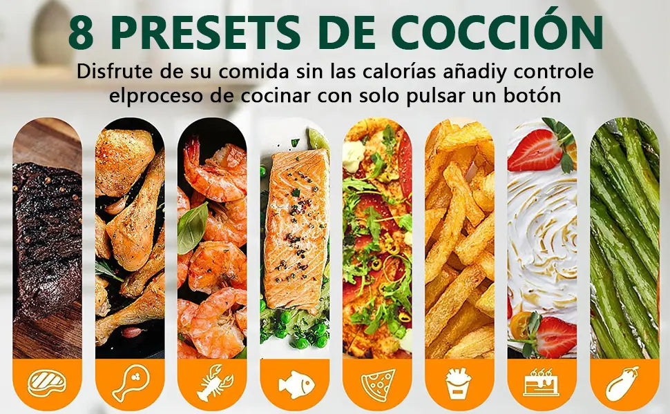Esta freidora de aire no solo permite freír sin aceite, sino también hornear, descongelar y otras funciones. Tiene un amplio rango de temperatura ajustable (200-450 °F) para satisfacer diversas necesidades de cocción. Su tecnología de convección mantiene los alimentos crujientes y deliciosos sin dejar de ser saludables.
