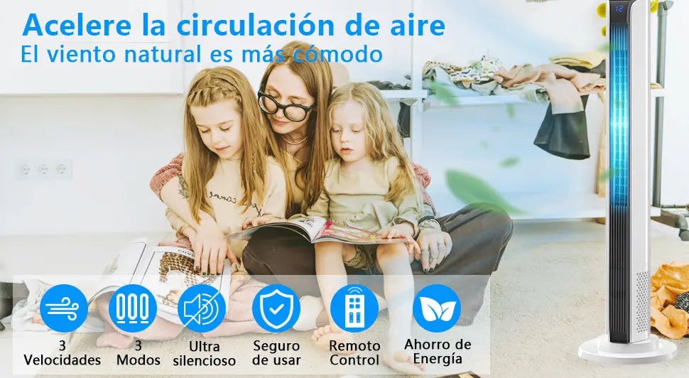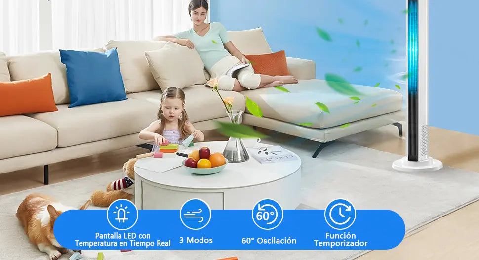 Este ventilador torre sin aspas de 105 cm de altura proporciona una ventilación eficiente, ideal para hogares, oficinas o dormitorios, con un diseño compacto que ahorra espacio. Funciona de manera ultra silenciosa a solo 40 decibelios, garantizando un ambiente tranquilo y cómodo, perfecto para uso nocturno. Equipado con un temporizador de 12 horas y una pantalla LED de temperatura, ofrece una operación inteligente y conveniente. El modo ecológico ahorra energía, y cuenta con una garantía de 1 año y un mando a distancia práctico. Fácil de limpiar, combina perfectamente el estilo moderno con la funcionalidad, siendo la opción ideal para hogares y oficinas.